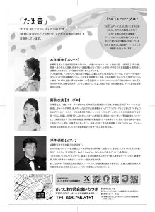 ホーム レッスンメニュー 発表会風景 音大受験を目指す方へ 入会の流れ よくある質問 アクセス 楽器選びについて 新着情報 お問い合わせ Information さいたま市民の日記念事業コンサート🪈 2026.02.09 講演会情報 たま音〜Tamane〜のコンサートのお知らせです🪈 さいたま市民の日記念事業のコンサートに出演します♪ 音楽を身近に楽しんでいただける、お話付きのプログラムになっています。 皆様のお越しをぜひ、お待ちしております! SaCLa3月号、4月号、2/13(金)毎日新聞埼玉版 に演奏会情報が掲載されます🪈 一覧へ戻る 次へ »